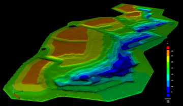A surface coloured by time since capture. From the legend, we can see that most of the surrounding combined model and parts of the pit in red have not been updated for 4-6 weeks or longer, indicating they might need to be resurveyed. The main pit area in green has been recently updated. |