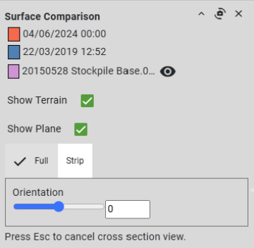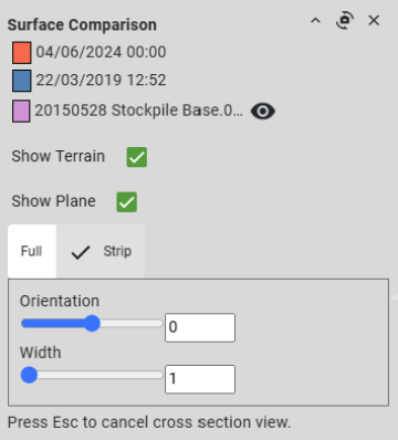 Orientation Move the slider or enter an angle in degrees to set the orientation of the cross section plane. The angle is an offset in the XY plane from north. Width Only available in Strip mode. Drag the slider or enter a distance to set the cross-section width.