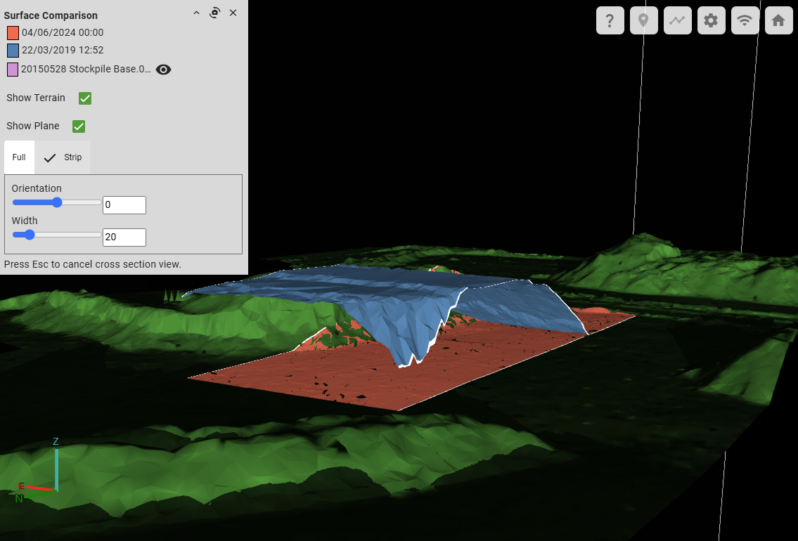 A cross sectional view of the surface is generated within the area defined by a supplied polygon or set of polygons, based on the specified date or date range. You can set the orientation of the cross section plane and move the plane using the controls that appear in the view.