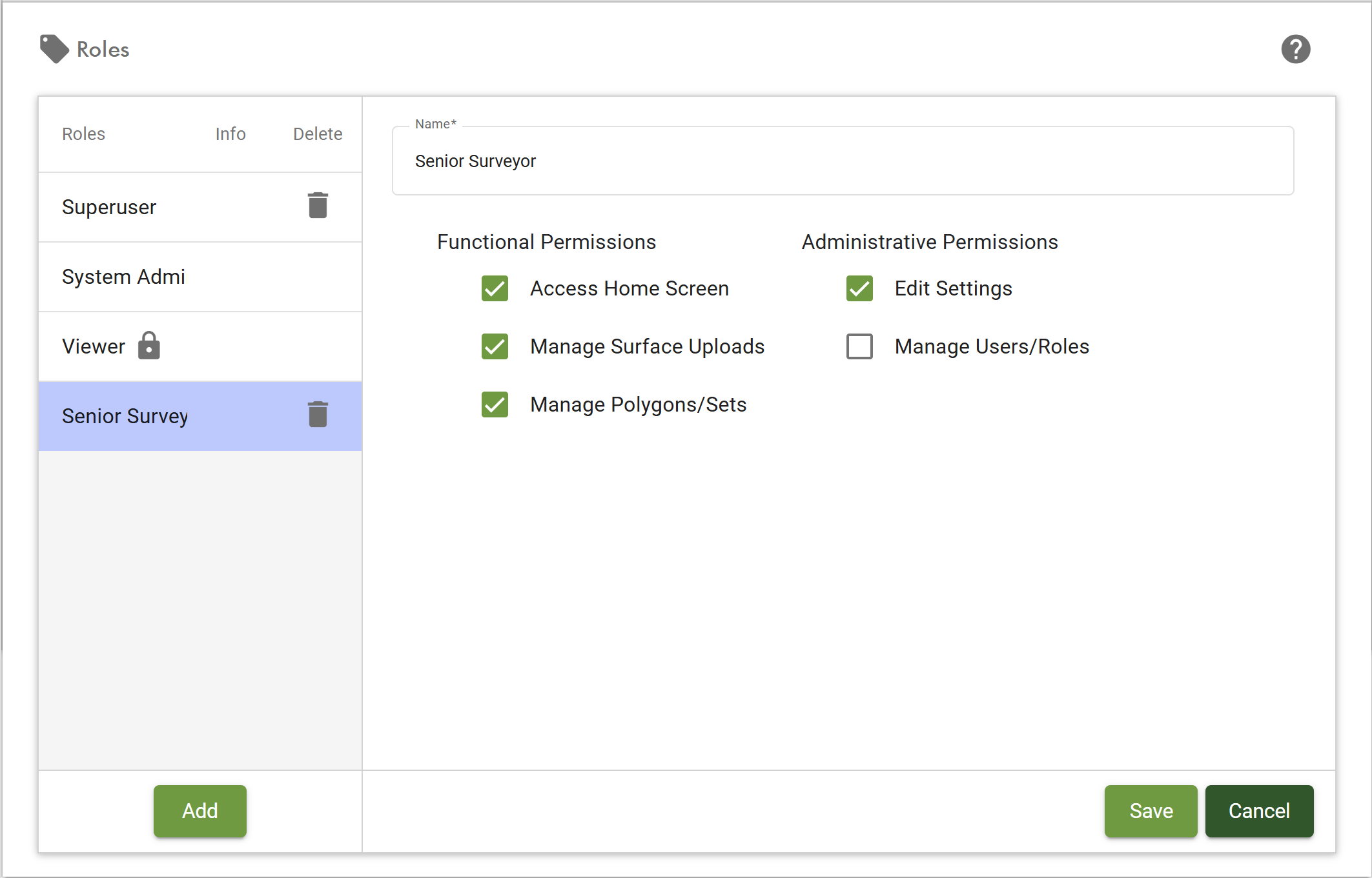 Individual users can have various roles assigned to them to restrict or enable access to various features. For example, to view and query the model you need to be assigned a role with the Access Home Screen permission, and to upload new source surfaces you need to have the Manage Surface Uploads permission. At least one user with a role that enables the Edit Settings permission must be defined to allow the other settings to be configured. You can either use the predefined Superuser role for this purpose, or define a new named role that enables this permission.