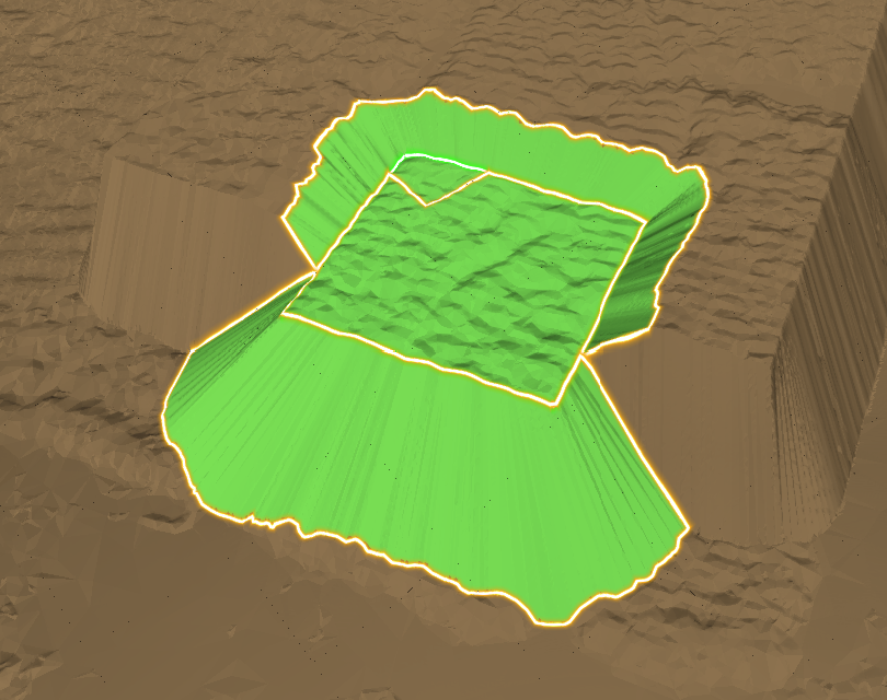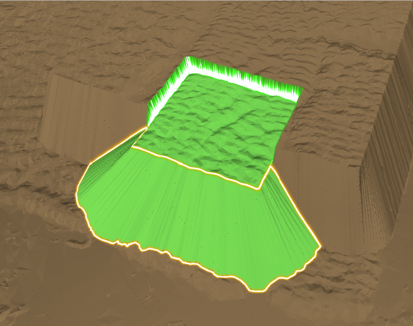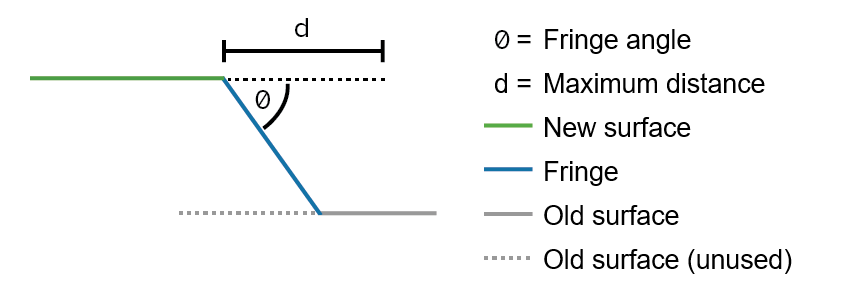 New surfaces can contain differences in elevation with the old surface along their boundaries. These differences can result from minor registration discrepancies or missing data that was not captured in either the old or new surfaces. In such cases, GeoSpatial Manager can either honour the data exactly or alternatively add a fringe to each new surface. A fringe is a sloping extension added to a new surface to provide a smooth transition to the old surface. Without a fringe, elevation differences result in abrupt, cliff-like vertical jumps along the boundary.