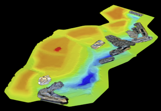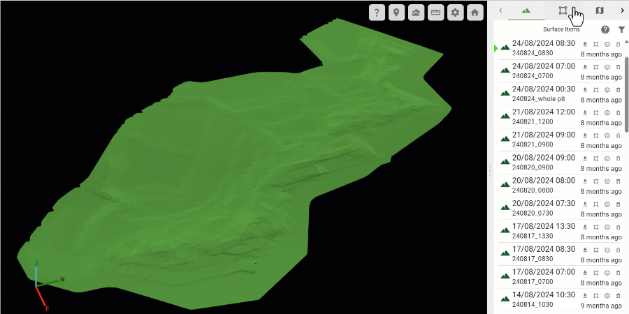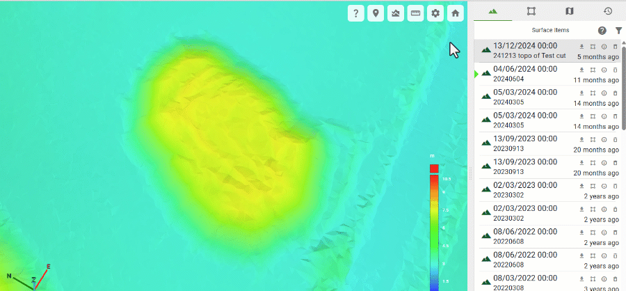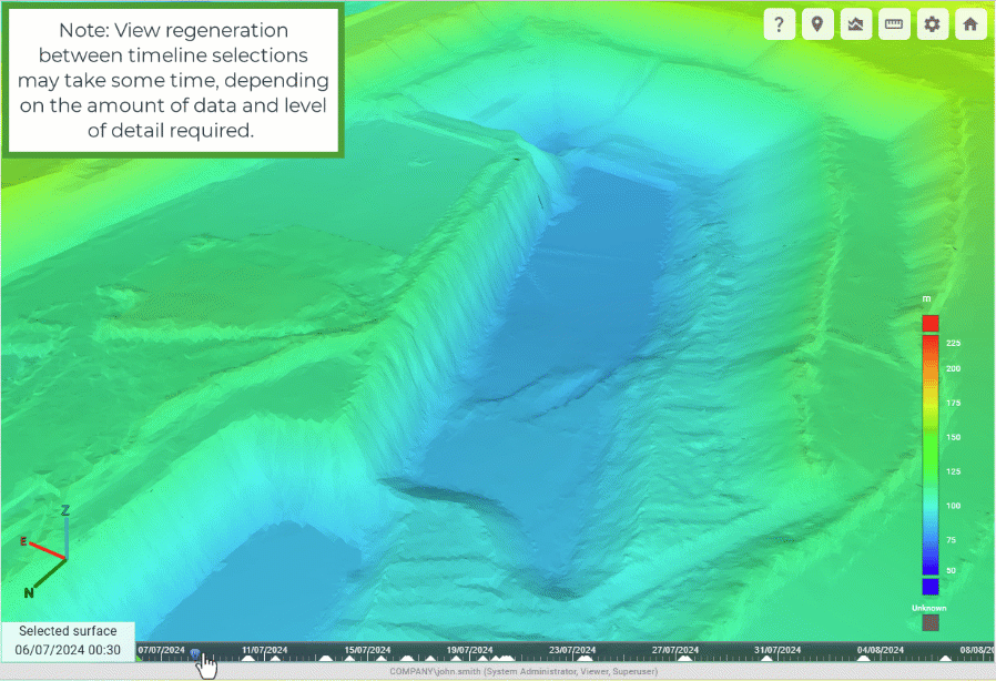 GeoSpatial Manager can display the as-built surface for any point in time between the oldest source surface and the most recent source surface. The timeline located at the bottom of the viewer represents each uploaded source surface with a triangle. The green triangle represents the currently selected surface. The surface in the viewer is a model built from the combination of all source surfaces from the oldest to the selected surface.