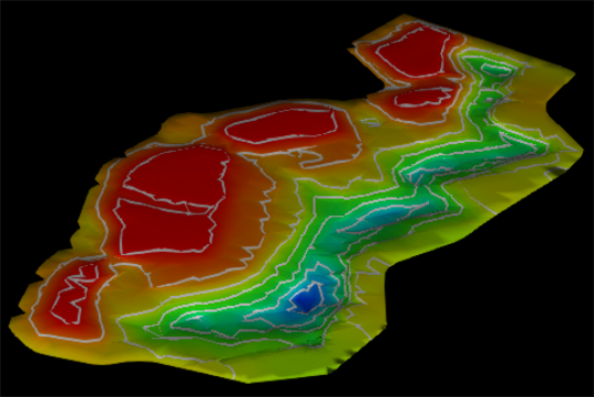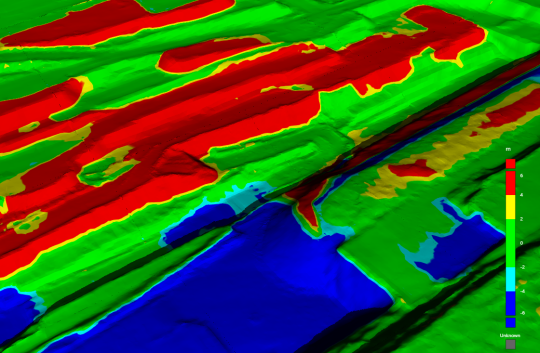 Colour the surface by the change in elevation over a specific time period or deviation from a selected design surface. This colouring option is useful to quickly visualise which parts of a site have been subject to the most activity.