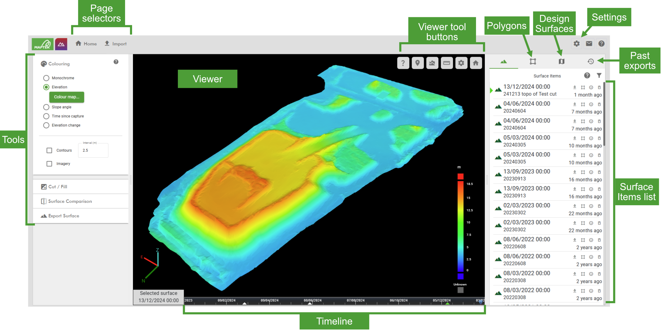 The Cut / Fill tool allows you to calculate surface volumes and tonnages in relation to elevation, date range or a design surface. See Cut / Fill for detailed instructions on calculating cut and fill.