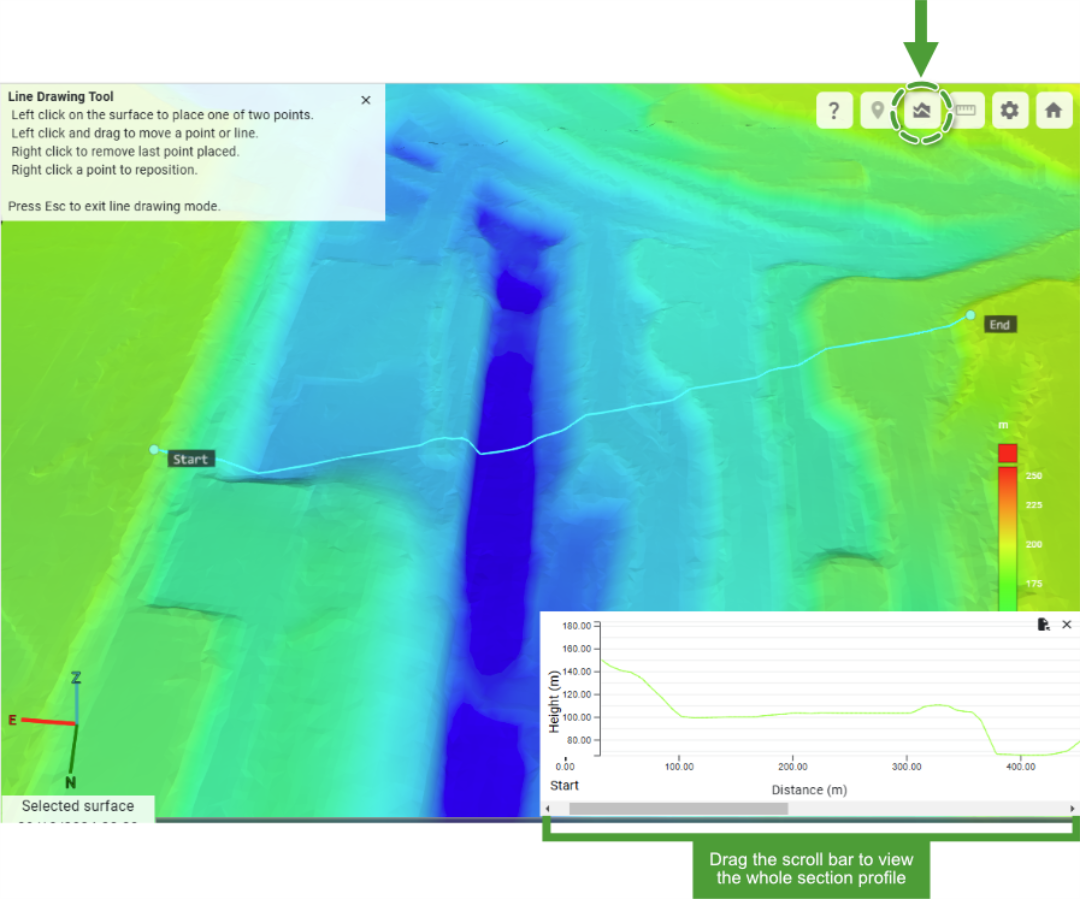 The Surface Comparison tool allows you to view the parts of the surface behind an intersecting vertical plane. You can opt to display the surface at a single point in time, or compare the surface between two points in time.