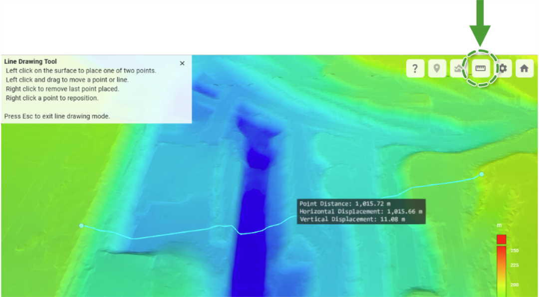 Distance Query Query the distance and horizontal/vertical displacement between two points clicked on the surface.