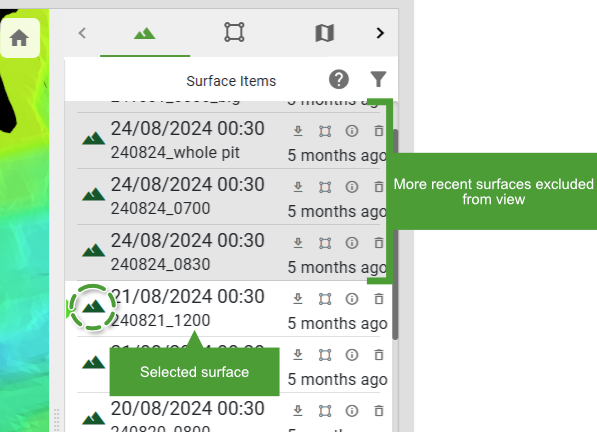 The uploaded source surfaces contributing to the as-built model are listed in the Surface Items list in the right-hand pane in descending chronological order; that is, the most recent source surface appears at the top of the list.