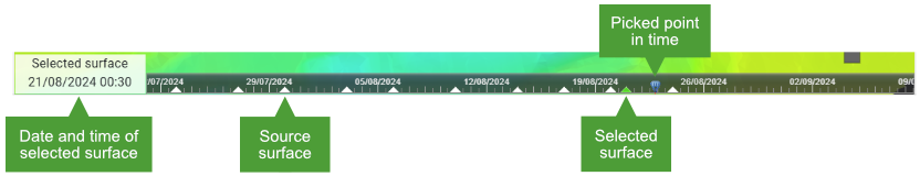 Timeline | Use the timeline to set the selected surface, or define time ranges for tools that require it. See Selecting a surface in the timeline on this page for more information on using the timeline. |