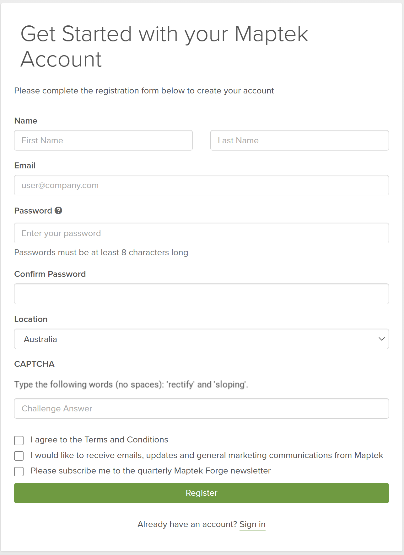 To register a user for Maptek Account, follow these steps: