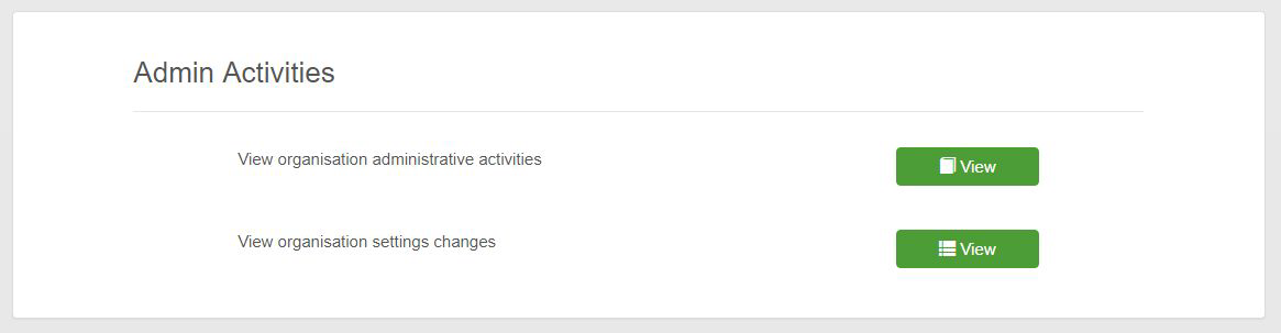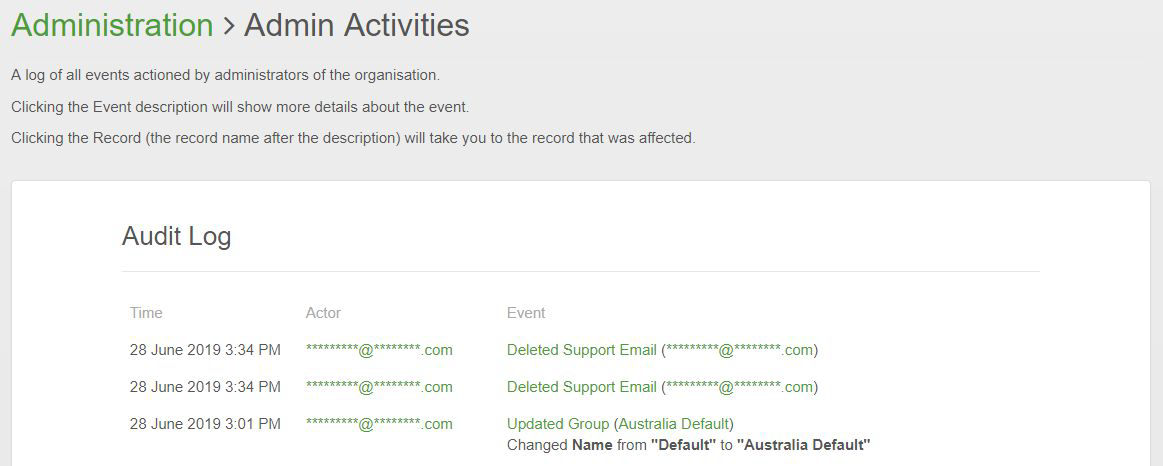 This section contains logs of changes administrators have made to users, groups, entitlements, or the global organisation settings.