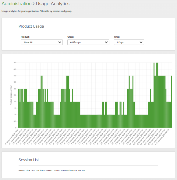 Initially, a chart of total hourly product usage for the last seven days is displayed. You can configure the chart with the following drop-downs in the Product Usage pane: