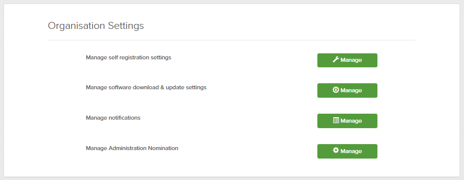 Global settings for the organisation include self registration, software download and update settings, and defining how notifications are managed.