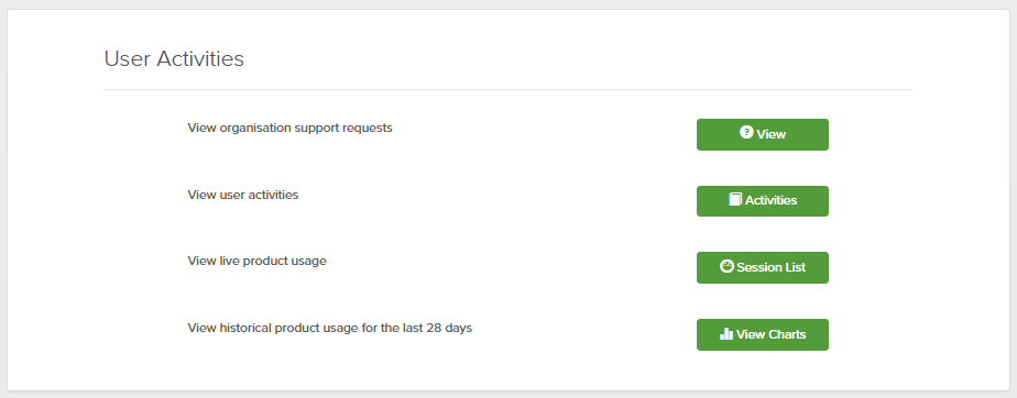 This section includes functions that relate to the following actions of users: organisation support requests, a master log of all user activities, and software usage.