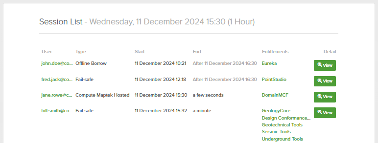 View live product usage shows software usage sessions, listing users accessing entitlements, sorted into the following tabs: