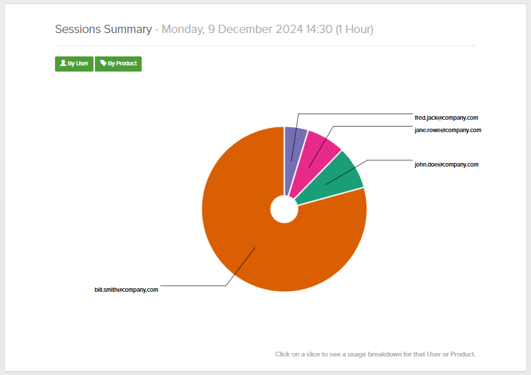 Click By Product to display the pie chart based on time each product was in use. Hover over or click on a segment for similar statistics, as with By User.