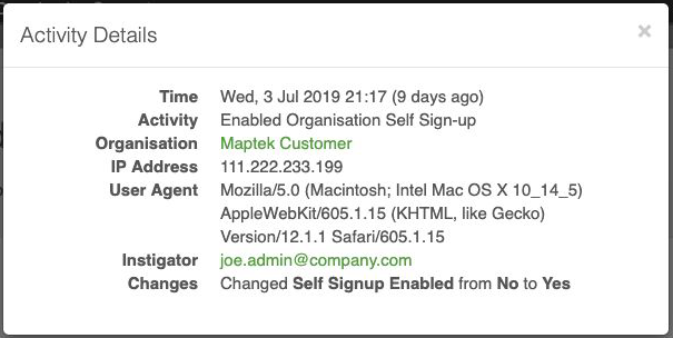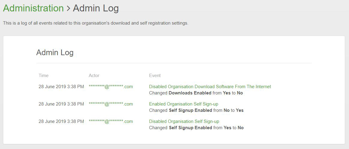 View a log of all events related to the organisation’s global settings, such as download and self registration settings.