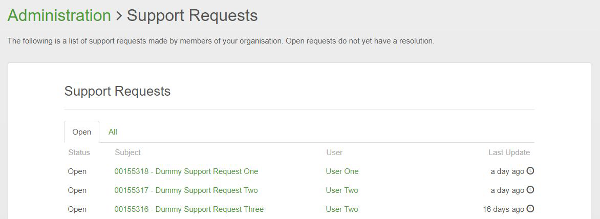 View the list of all the support requests that users have submitted, including a summary of their statuses and subjects. By default, only the open requests are shown; click on All to display closed cases as well.