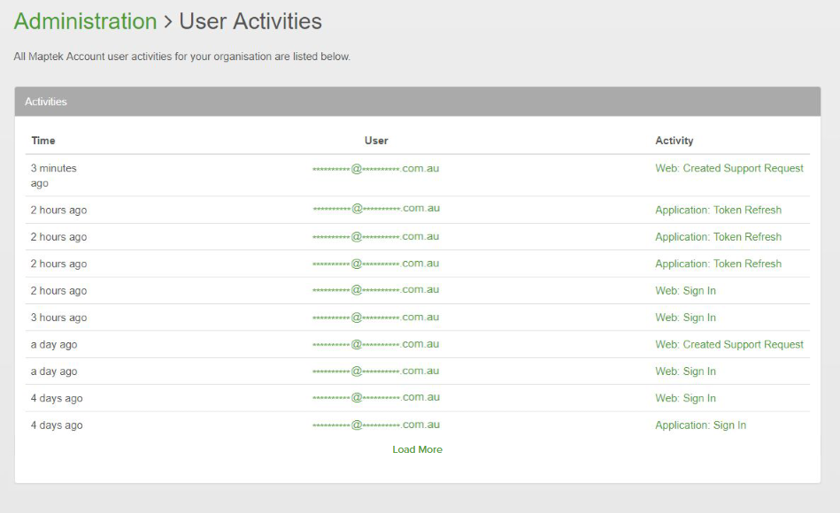 View a chronological list of all the activities users have performed in the organisation, including events such as signing in from the website or Workbench, creating support requests and changing personal details.