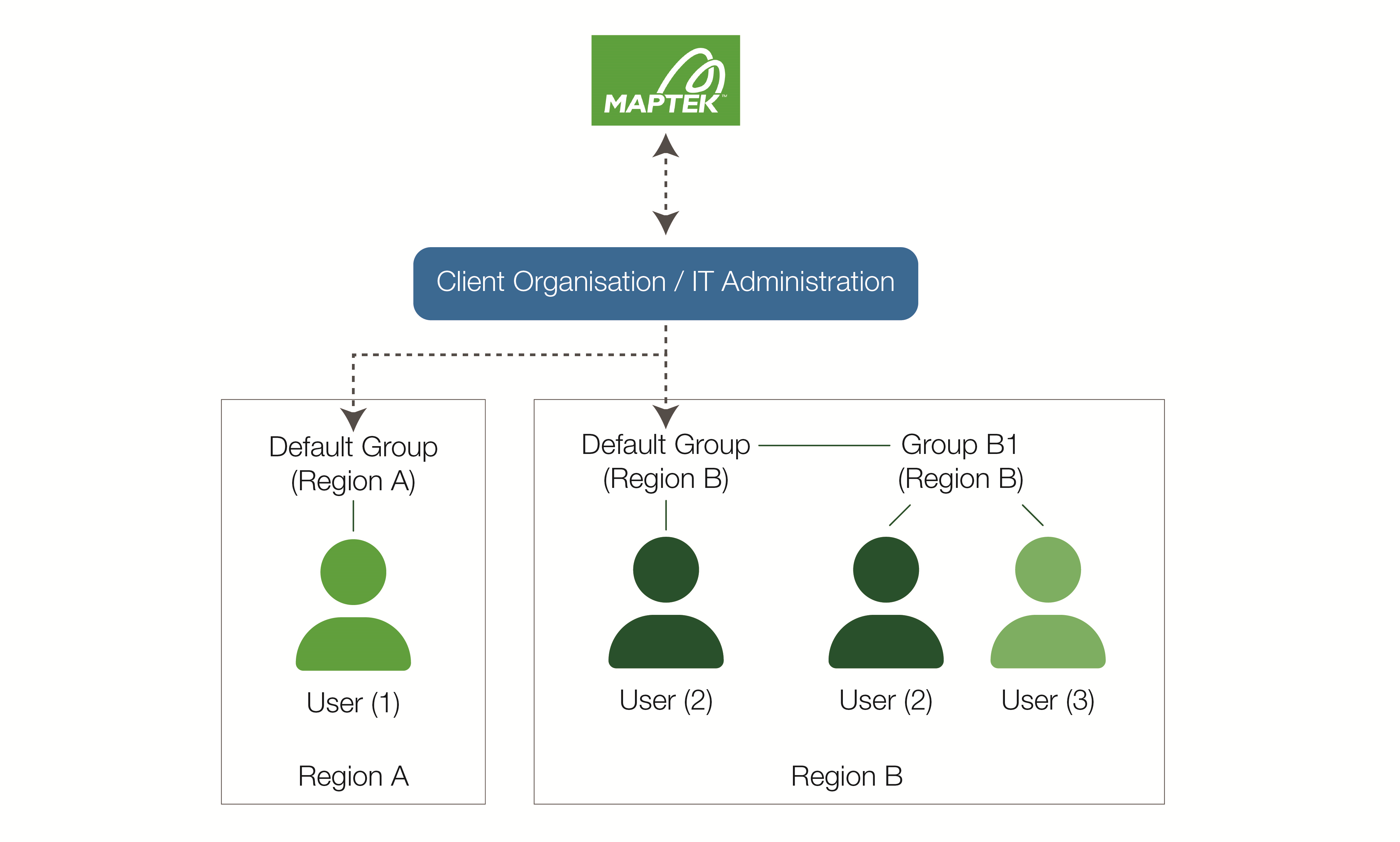 Each group must relate to a Maptek region; users in that group must also belong to that Maptek region. Additionally, entitlements must have the same Maptek region as the group they are allocated to. The organisation IT administrator is responsible for setting up groups and their regions, as well as transferring users between groups in their region.