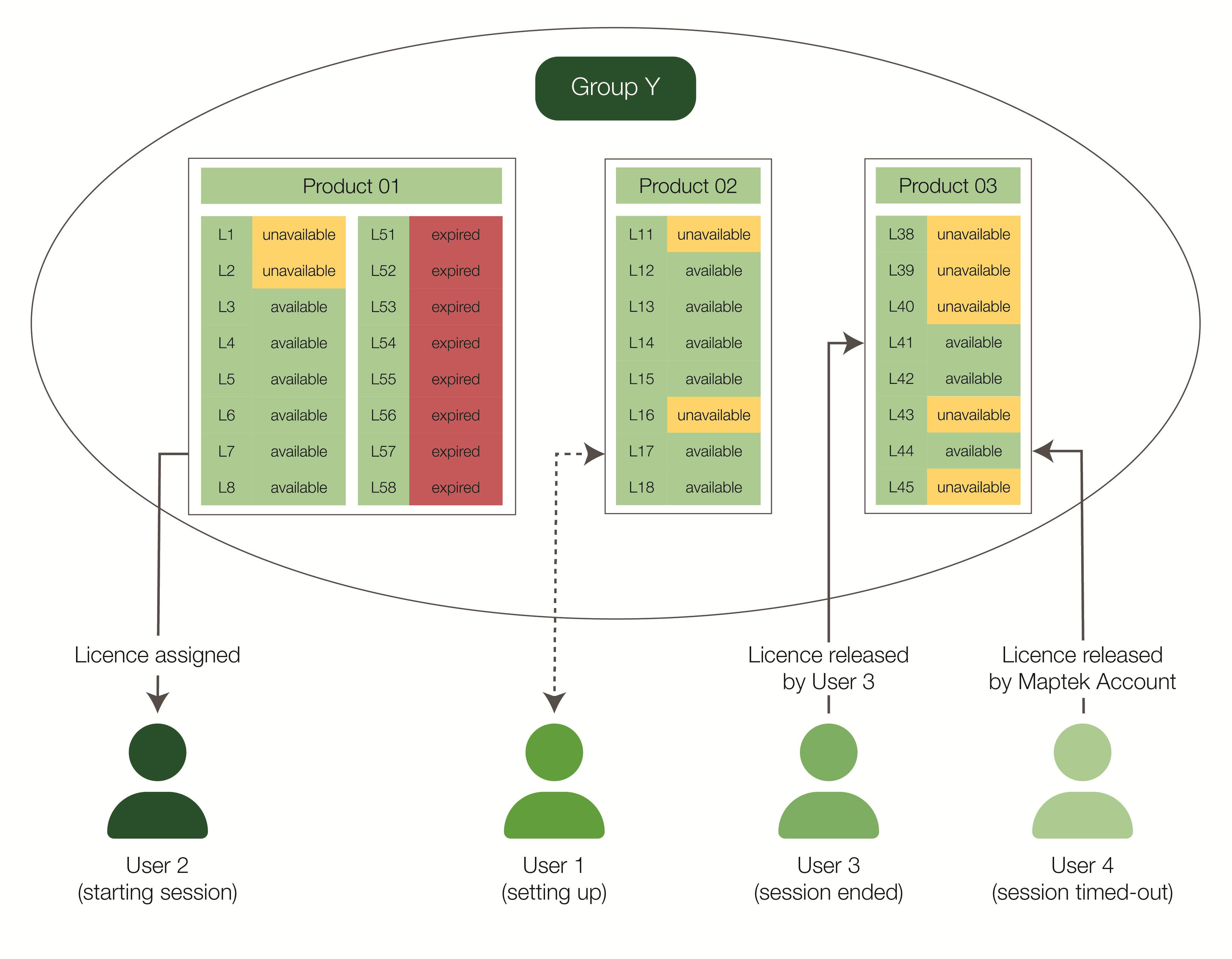 User 3 has just ended a session using software Product 03. The licence is released and Maptek Account makes it available for others to use.
