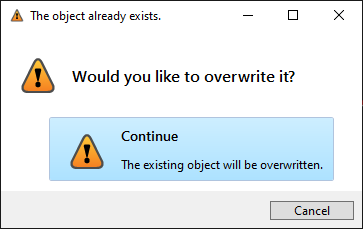 "Continue", "The existing object will be overwritten.", Icon.warning()