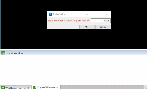 The request_float() operation is similar to the request_string() operation, except that it restricts the user to entering a decimal number. For example, the following script creates a window that the user can only enter a number into. It then writes a report stating the square root of the number the user entered: