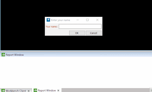 The request_string() operation creates a window in the connected application that the user can type into. For example, the following script asks the user what their name is and then writes a report to say hello to them: