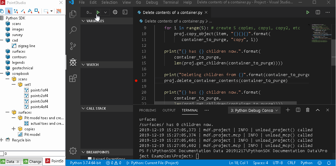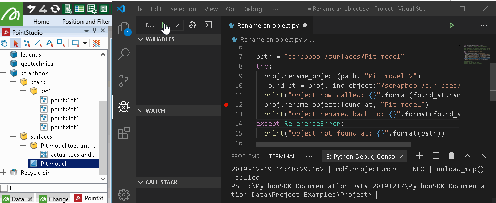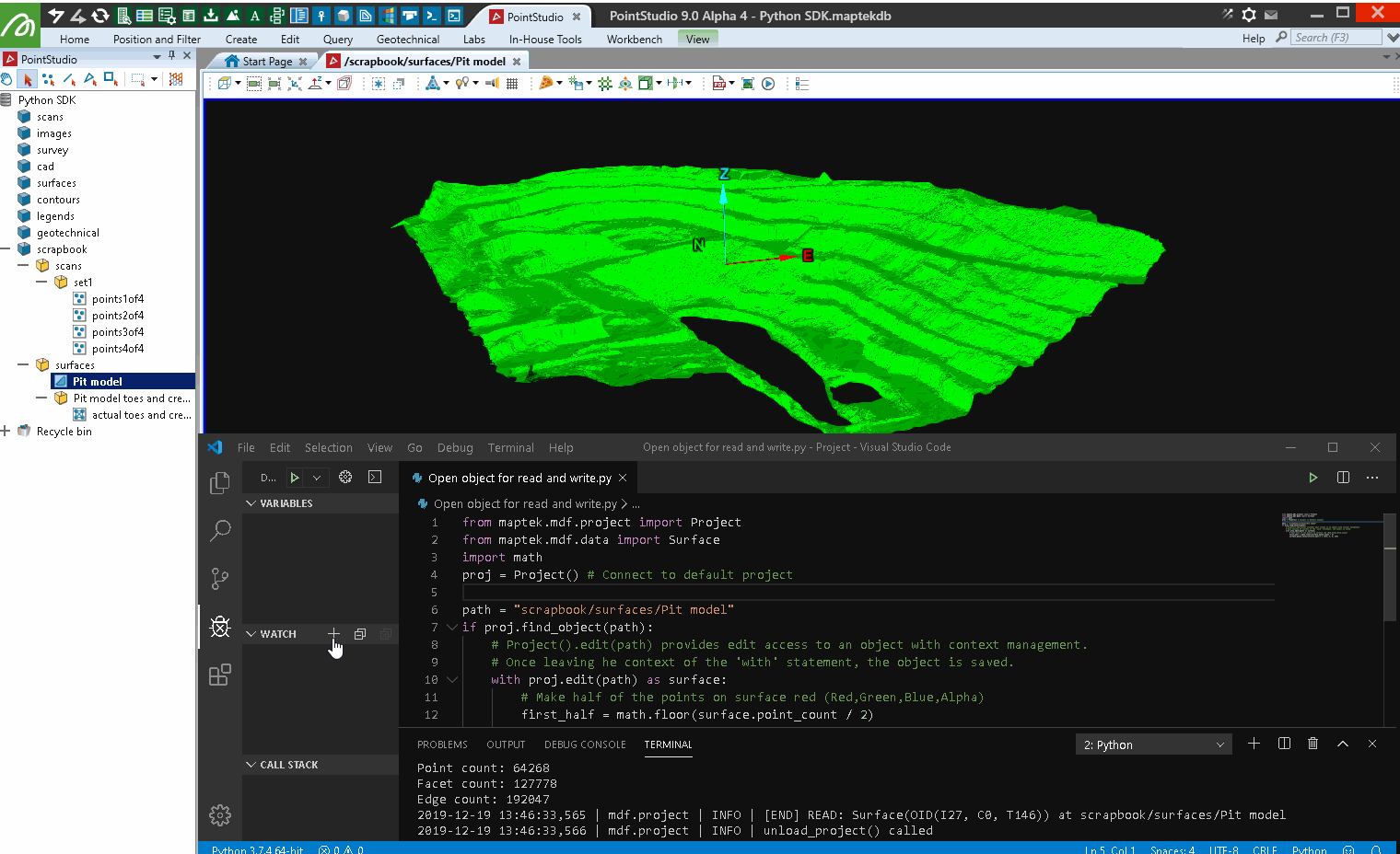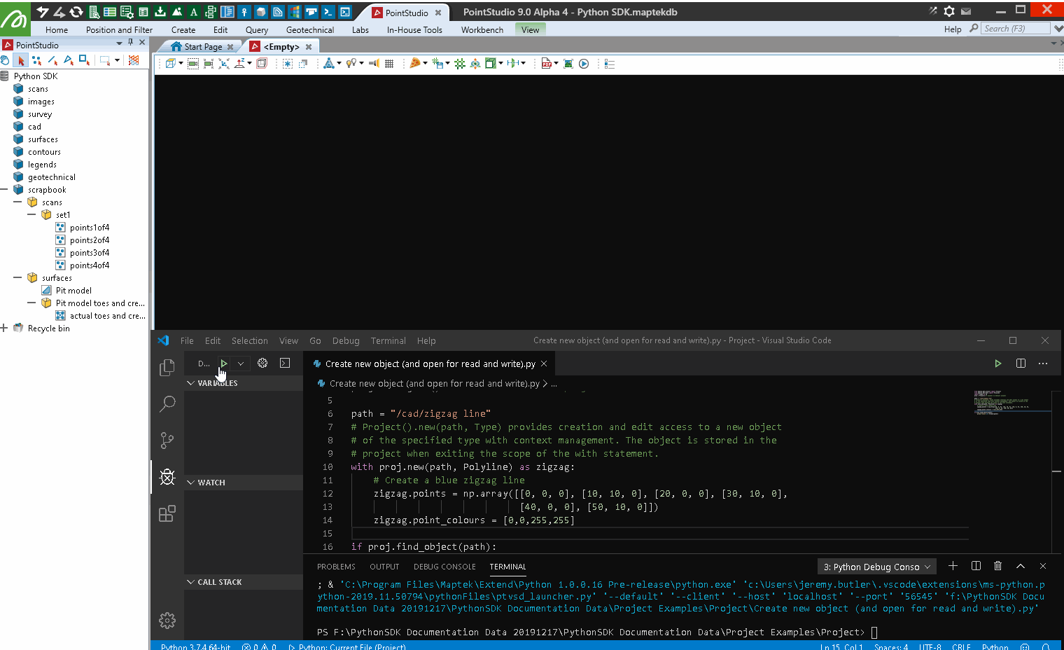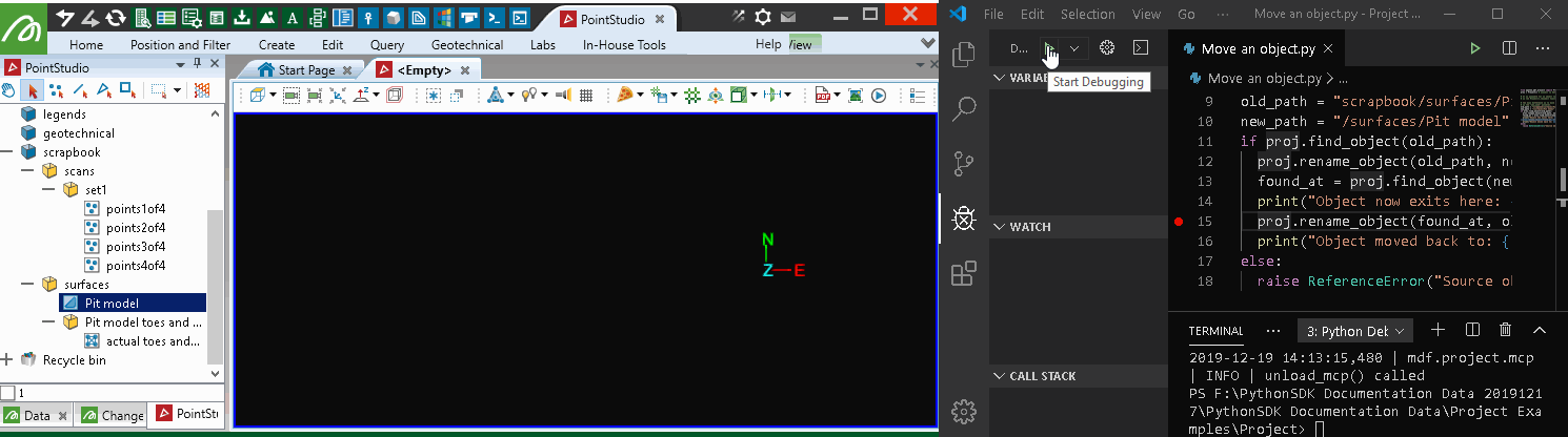When you open a Maptek application such as GeologyCore or PointStudio, you need to select or create a project to work in. A project serves as a local repository of data that you interact with during your session. When writing a script using the SDK to operate on your data, one of the first steps is to connect to a project that is open in a running application instance. This page explains how to do this and describes common ways of interacting with a project.