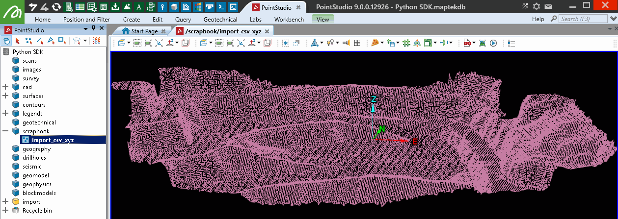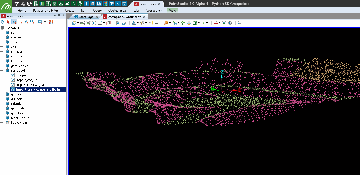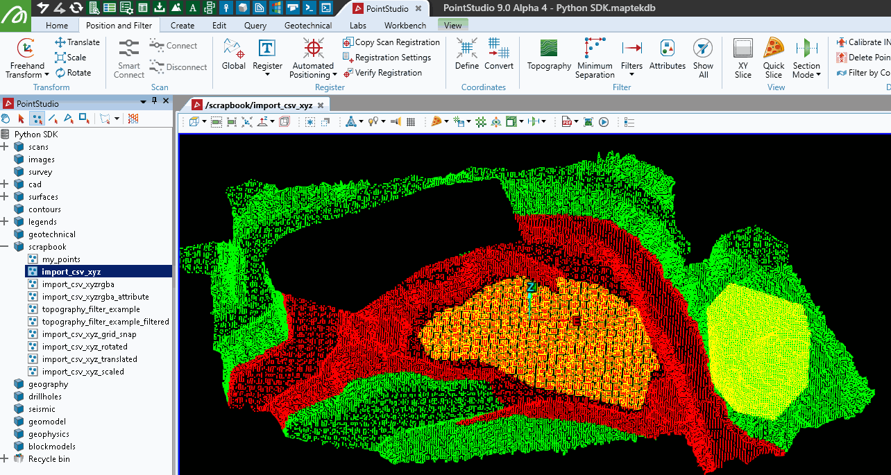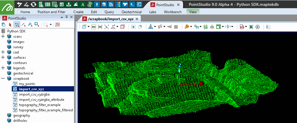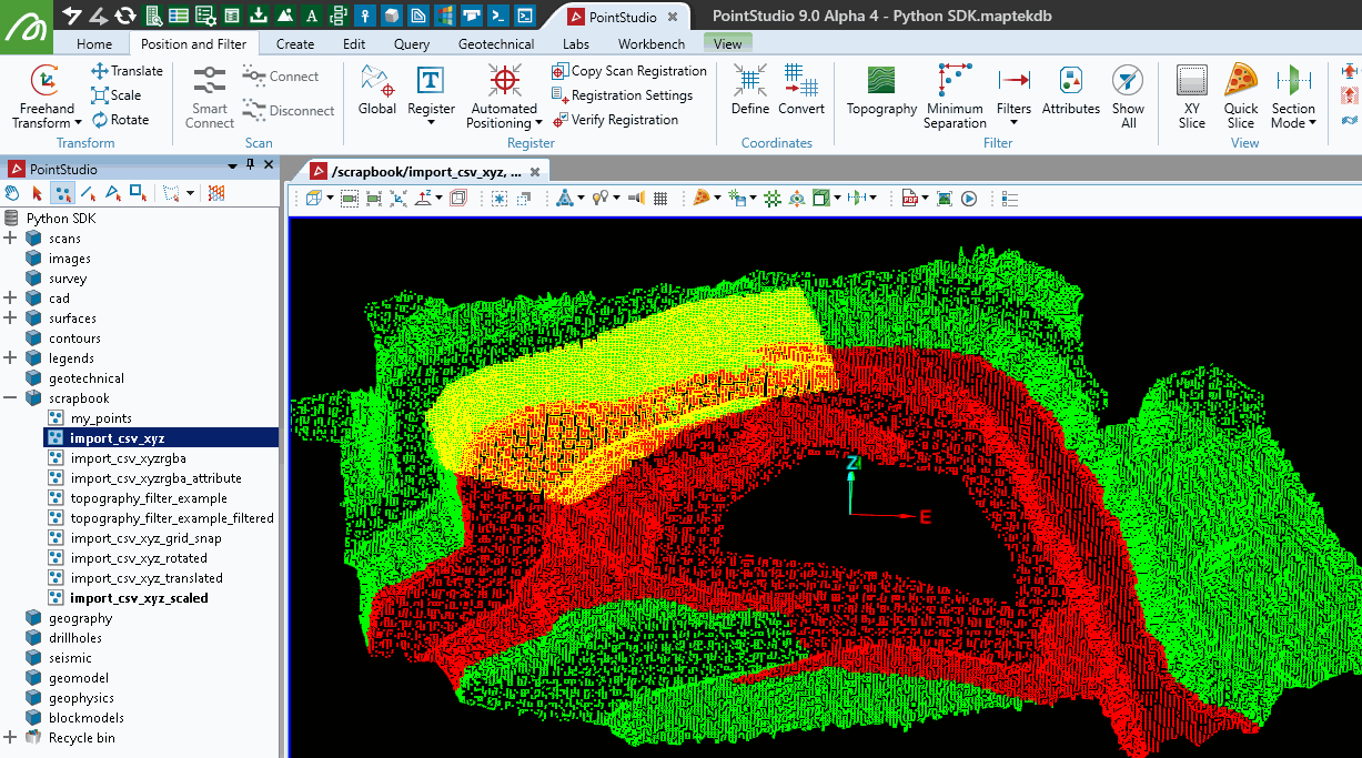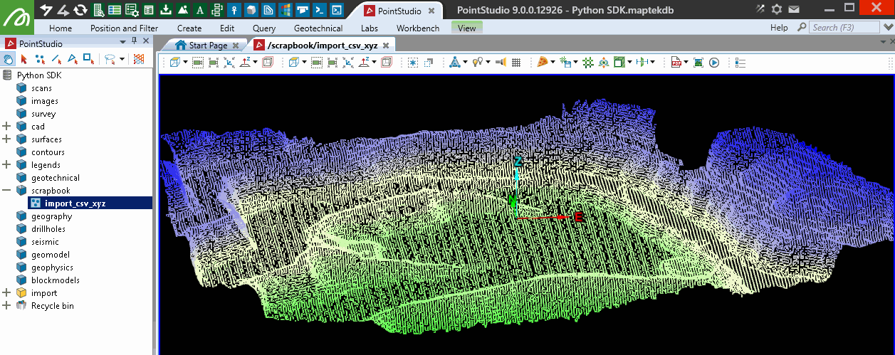 Note: To run the example scripts provided on this page, first download and extract Maptek_PythonSDK_Sample_IO_Files_20200108.zip to a folder on your system. The example scripts reference the folder location F:\Python SDK Help\data\. You will need to update this location in the scripts to match the folder where you extracted the files.