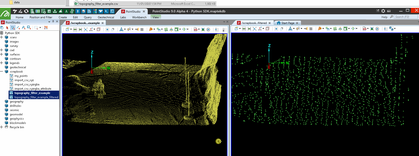 This example demonstrates how to apply a topography filter to a point set, similar to the Topography Filter tool in PointStudio. The filter divides the point data into a horizontal grid with a defined cell size, retaining only a specified number of the lowest or highest points within each cell.
