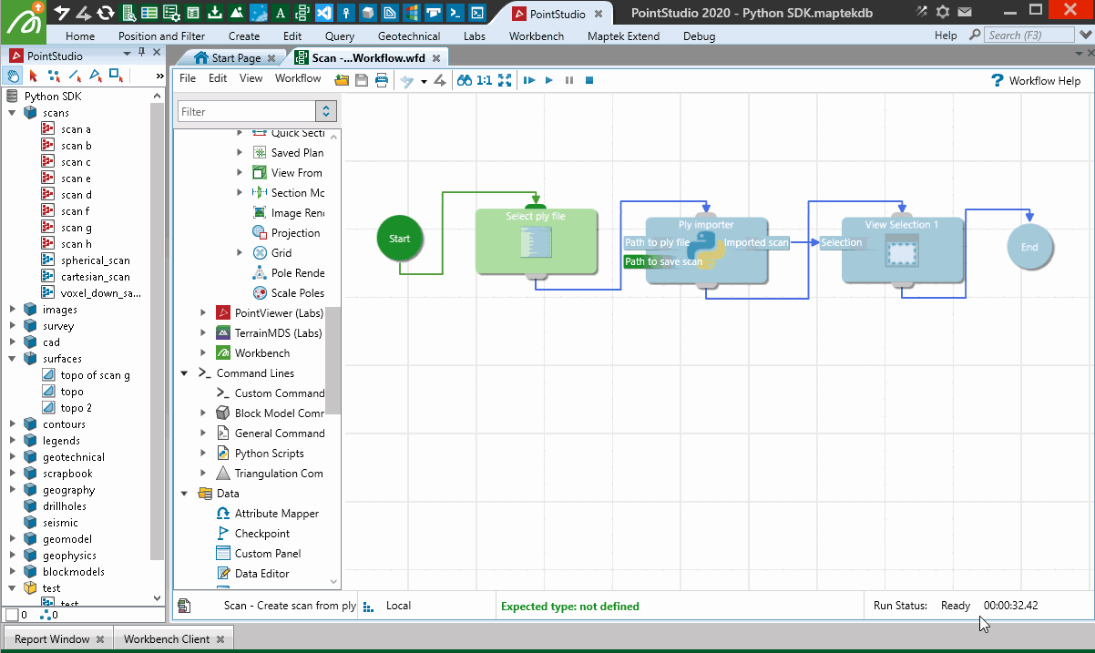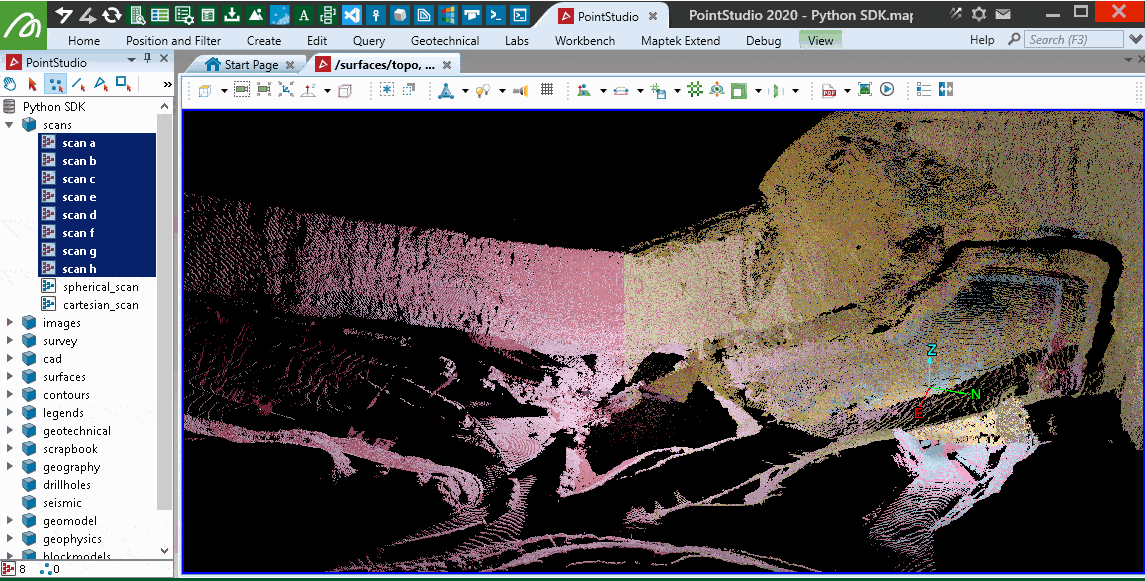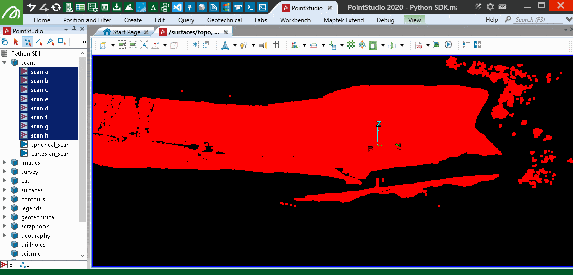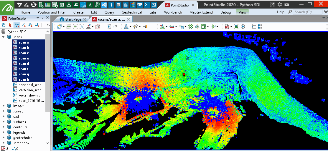 From the perspective of the scanner, the set of points acquired can be viewed as a grid structure, with each point sitting within a single grid cell. Scans can be connected such that the topological relationship between adjacent points in the grid is acknowledged, or disconnected, so that the grid structure is ignored. Scans can thus be viewed and operated on either as point clouds or as grid structures, depending on the required application.