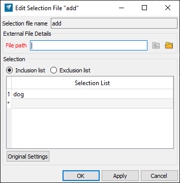 This selection file will only match the exact name “dog”. Selection files are case-sensitive, so the pattern in this example will not match names like “Dog” or “DOG”.