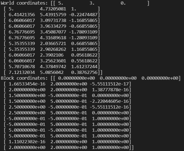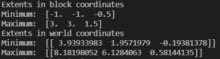 Running this code will copy the block model from the previous example and print its world and block coordinates, which should look like this: