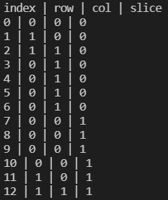 print(f"{i} | {int(row)} | {int(col)} | {int(slice_)}")