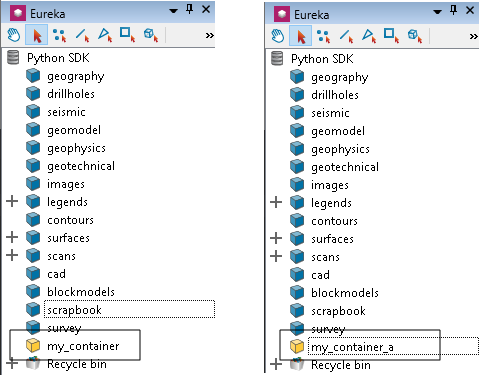 The Maptek Python SDK class VisualContainer represents visual containers in your project. This class inherits from the Container base class, but you will not typically need to interact with the base class directly.