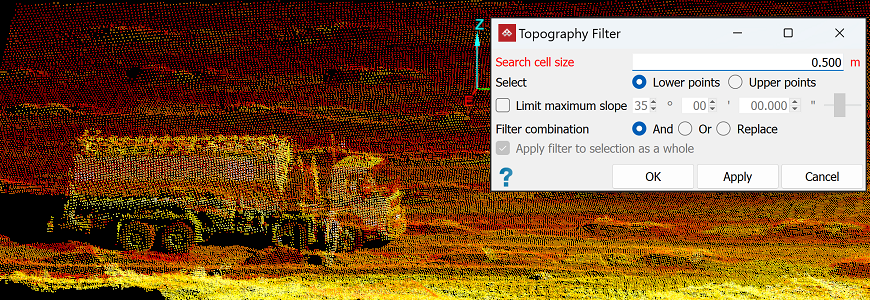 The tool will apply the filter parameters to hide the unwanted points and retain only the topography.