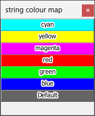 An object that assigns colours to textual string values. Use these maps to colour objects via user-defined properties, which are defined for each primitive in an object. See Legend > Text Legend Editor to learn more about how to use string colour maps. |