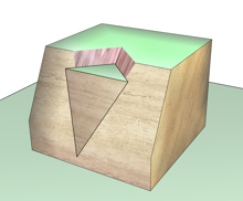 Dislodgement and downward-sliding of blocks along two intersecting, common failure planes. |