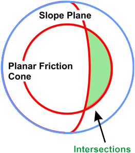 Planar friction cone Plane intersections that occur within the planar friction cone are steep enough to overcome friction and start sliding. That is failure may occur when line of intersection dip (between two discontinuities) > friction angle (assuming friction only). |