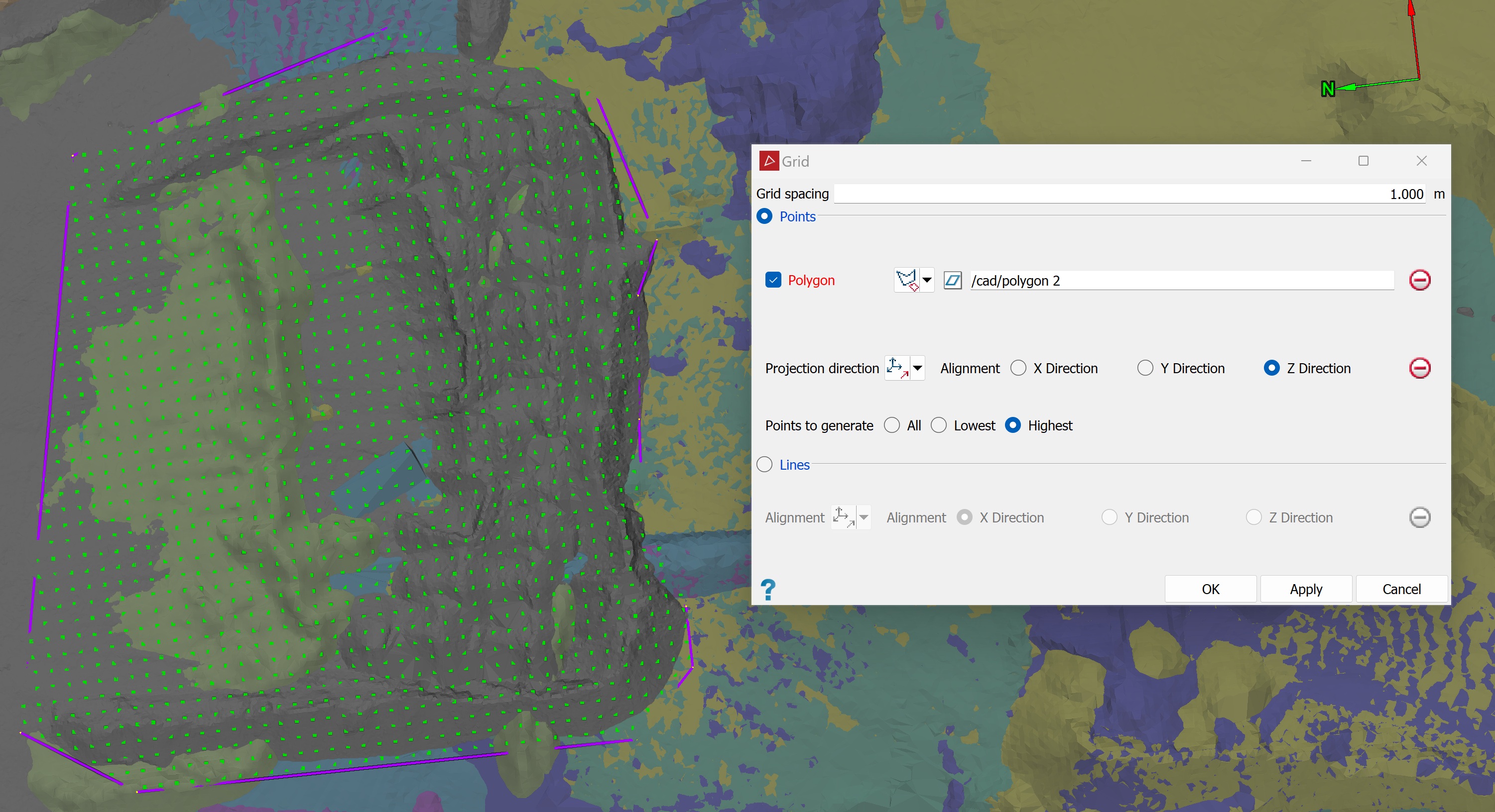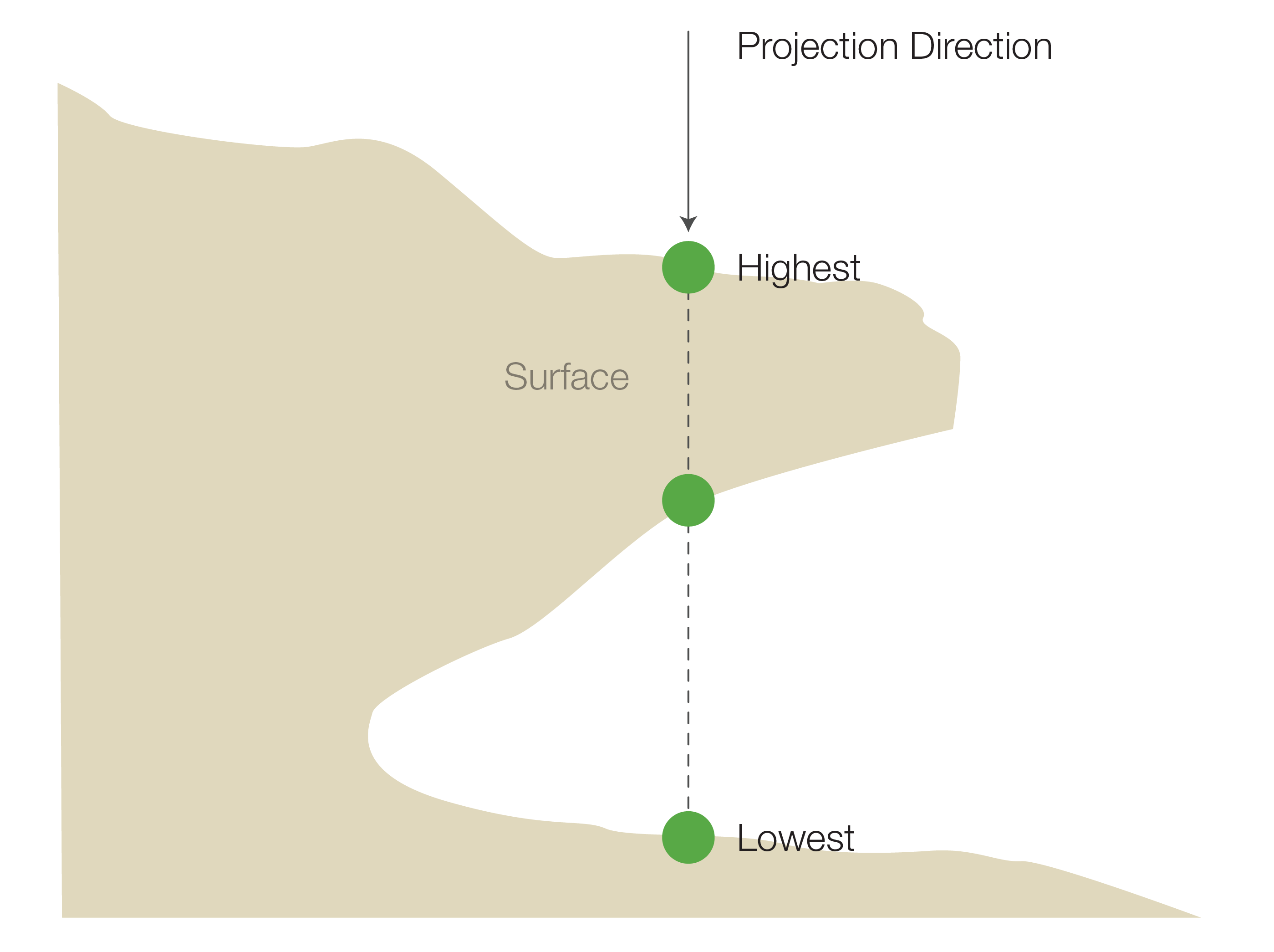 A representation of points that would be selected with overhanging data, depending on the chosen Points to generate option. Selecting All will generate all points in the projection direction.