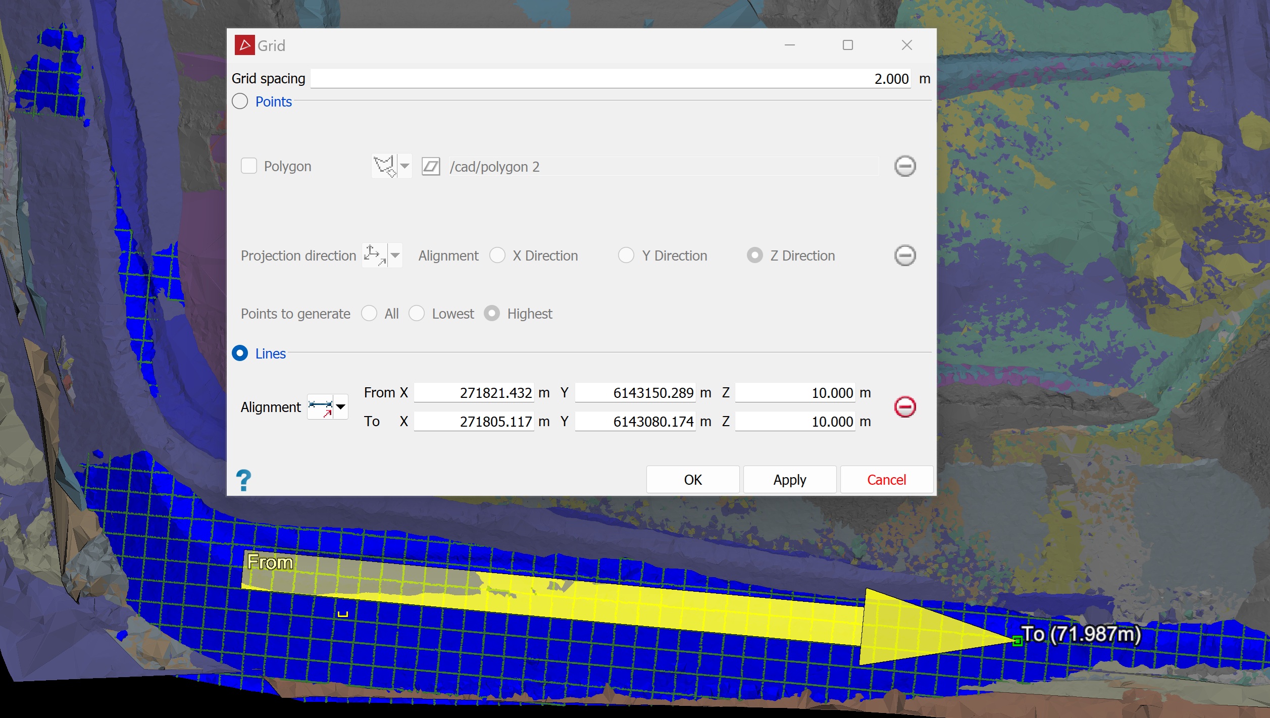 Note: Only the X and Y components are used in creating the grid. The grid is always projected in the Z direction. If no X or Y alignment is provided, the grid will automatically align with the axes.