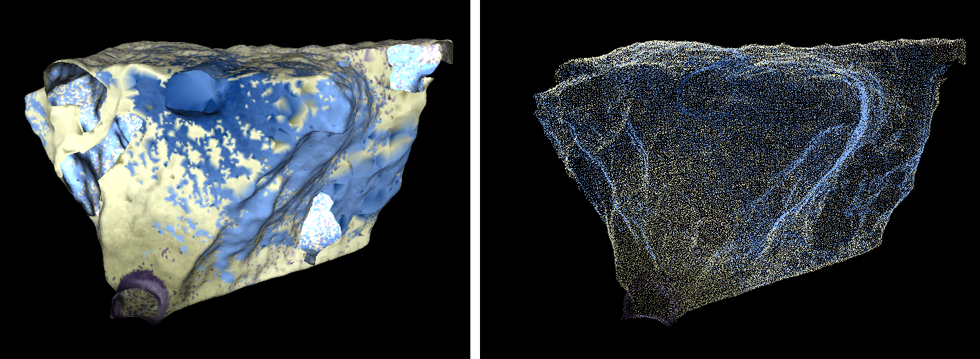 Note: Holes can occur in the model if the feature size guide is so small that the procedure cannot find a neighbouring point close enough to connect to. Larger feature sizes will result in fewer holes in the surface, but may also result in spike artefacts and less detail representing the true shape of the stope or ground.