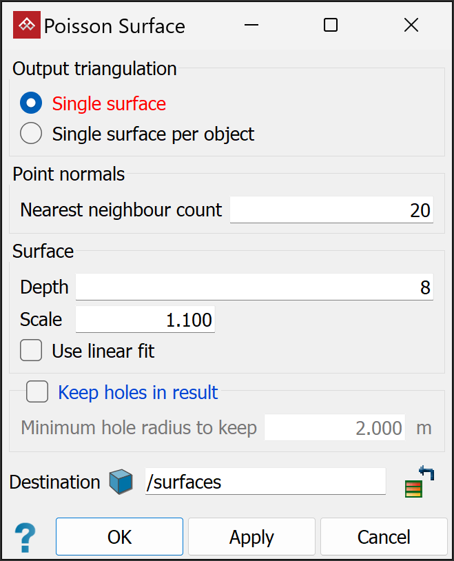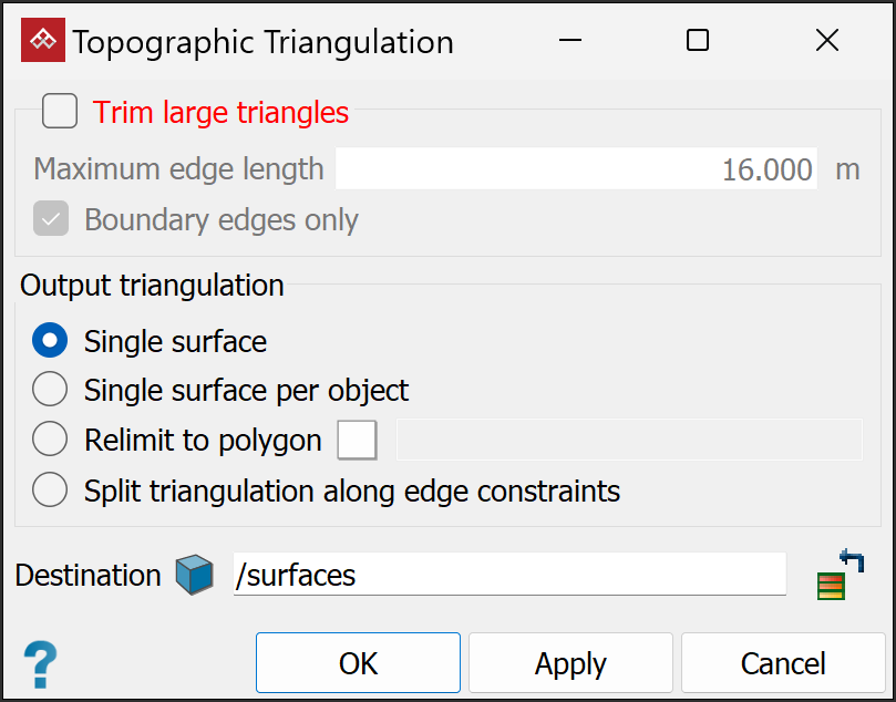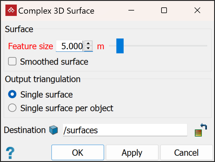 surfacescontainer. You can choose a different container in the Destination field.Note: Where surfaces are created from multiple objects, they are named either Triangulation or Smoothed triangulation.