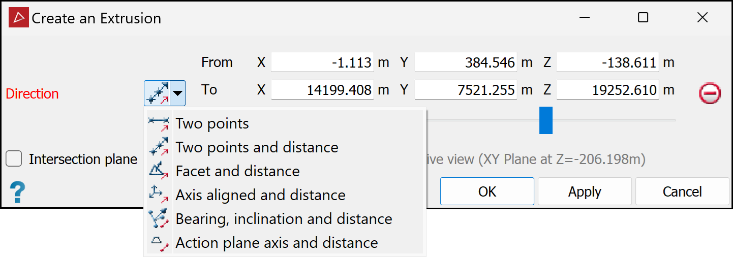 Set the Direction of the extrusion by selecting one of the following options from the drop-down list and specifying its criteria: