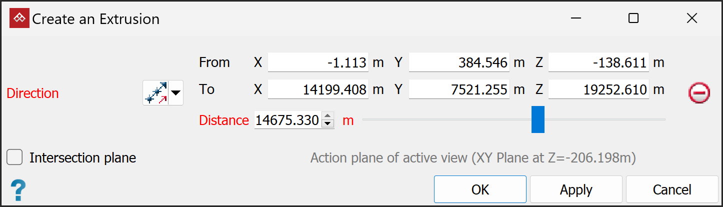 If the extrusion must be terminated by an intersecting plane, rather than by a defined distance, select Intersection plane and put the action plane in the required position.
