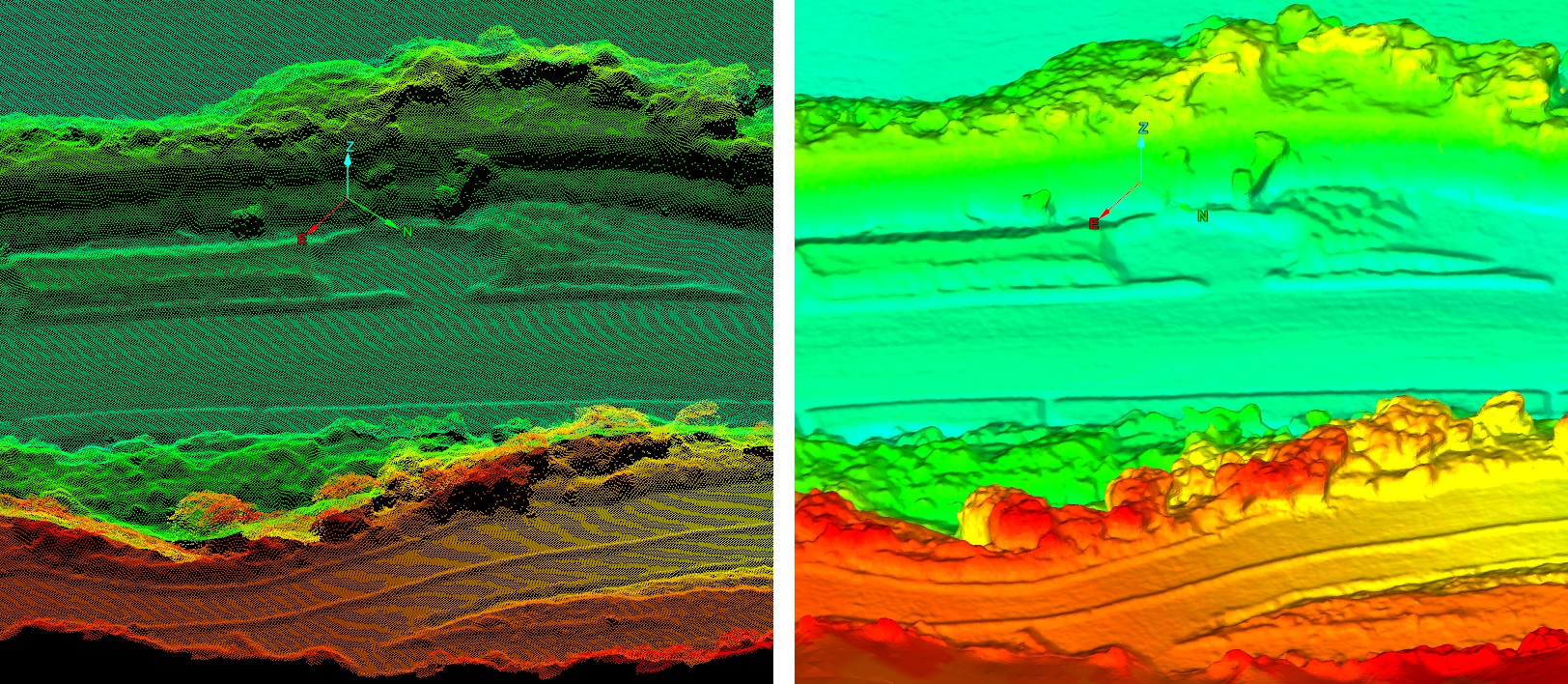 The Complex 3D surface tool provides a simple solution for creating surfaces from point clouds where the existing methods do not adequately model the nuances of the actual ground or surface. The method only requires input of a guide to the smallest feature size, with which the tool will build the surface based on points within proximity of each other, regardless of orientation. This approach is good for detecting and including even small indents, overhangs, and caves or holes that other surfacing methods would miss, and for modelling complex underground areas that include a number of pillars or interconnected tunnels.