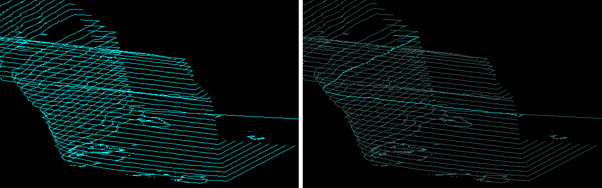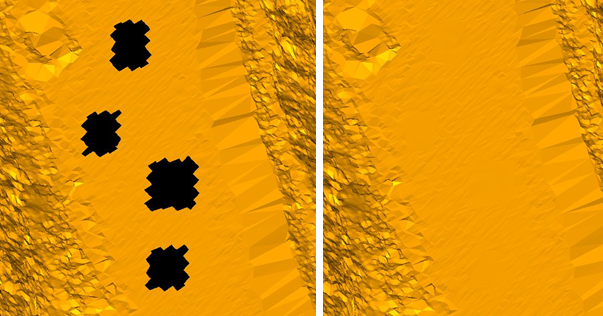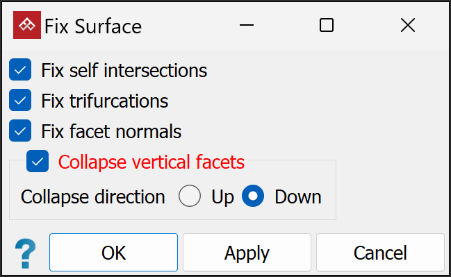 Collapse vertical facets: Remove vertical facets and close the resulting holes. This works by moving the points either along the bottom of the vertical region upwards, or along the top downwards, adding points as necessary to neighbouring non-vertical facets to maintain a consistent surface. Select the appropriate Collapse direction.