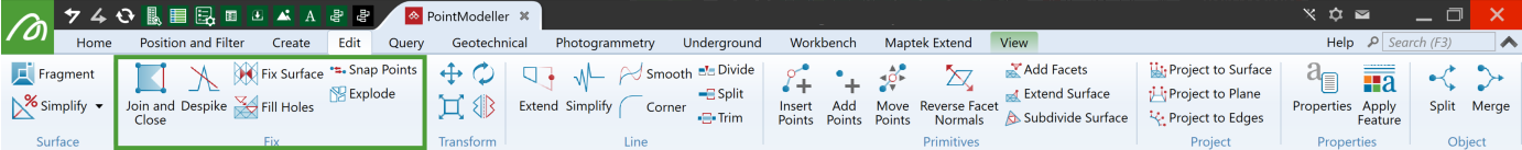 The Fix group tools on the Edit tab enable you to make various repairs to surfaces, scans or selections.