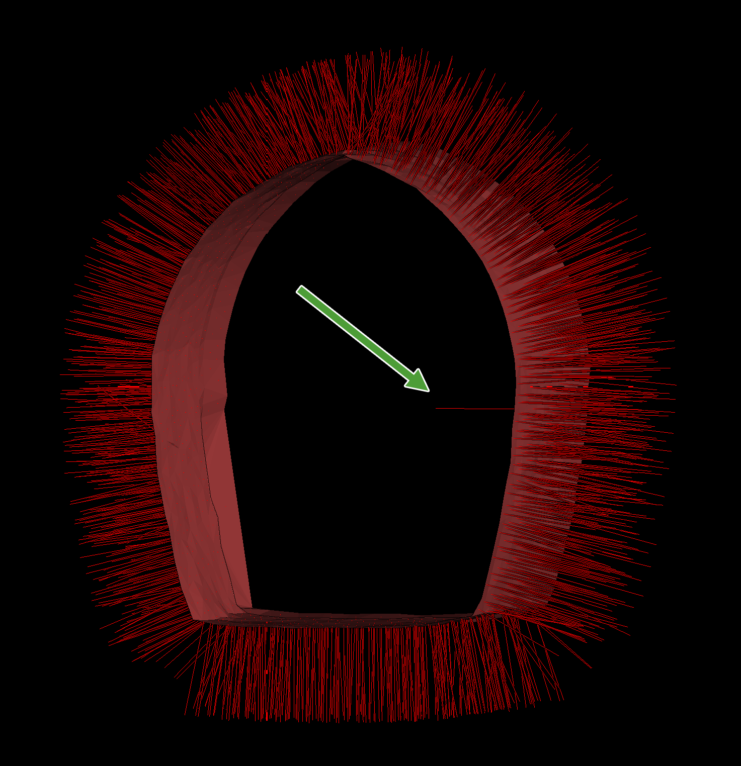 A tunnel surface where facet normals are supposed to point outwards, but one facet normal points inwards, indicated by the arrow. |
