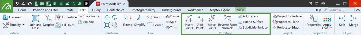 The Primitives group tools on the Edit tab enable you to modify objects by moving, adding or removing points or facets.